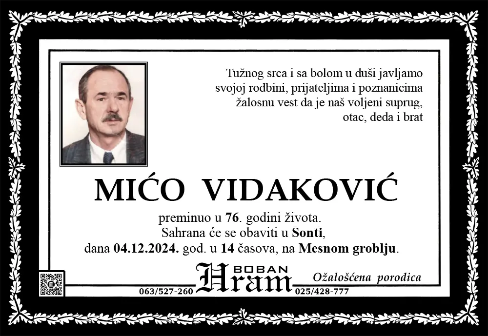 Umrlice i sahrane Umrlice Sombor – Najnovije smrtovnice i obaveštenja o sahranama. Hram Boban, vaša pouzdana pogrebna služba u Somboru.Podaci se ažuriraju svakodnevno. Hram ArhivaOvde možetete videti umrlice iz perioda starijeg od 3 meseca. Arhive » 2024 » 2024-Decembar Arhive » 2024 » 2024-Decembar 1 2 ... 4 ► Raspored sahrana u Somboru – umrlice i terminiU okviru ove sekcije objavljujemo raspored sahrana u Somboru, uključujući groblja, termine i druge relevantne informacije.Naš cilj je da olakšamo porodicama i prijateljima pristup neophodnim podacima. 1 2 ... 8 ►