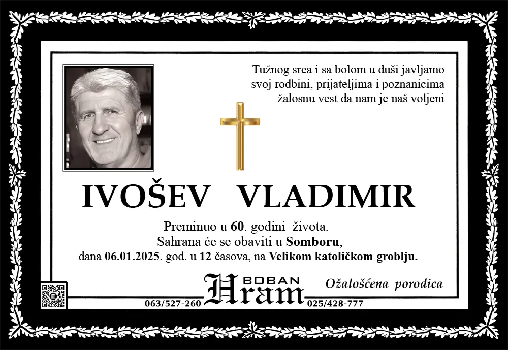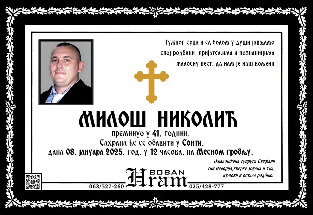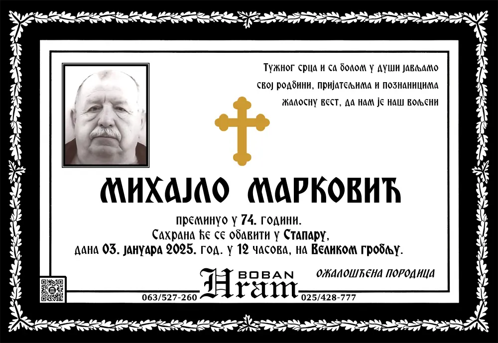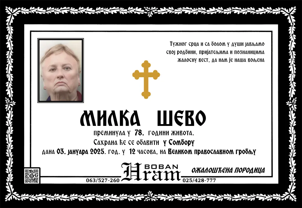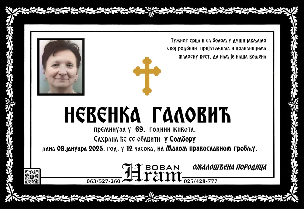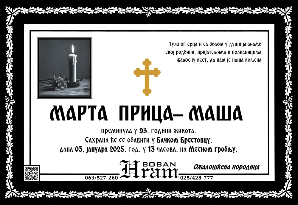 Umrlice i sahrane Umrlice Sombor – Najnovije smrtovnice i obaveštenja o sahranama. Hram Boban, vaša pouzdana pogrebna služba u Somboru.Podaci se ažuriraju svakodnevno. Hram ArhivaOvde možetete videti umrlice iz perioda starijeg od 3 meseca. Arhive » 2025 » 2025-Januar Arhive » 2025 » 2025-Januar 1 2 ... 5 ► Raspored sahrana u Somboru – umrlice i terminiU okviru ove sekcije objavljujemo raspored sahrana u Somboru, uključujući groblja, termine i druge relevantne informacije.Naš cilj je da olakšamo porodicama i prijateljima pristup neophodnim podacima. 1 2 ... 8 ►